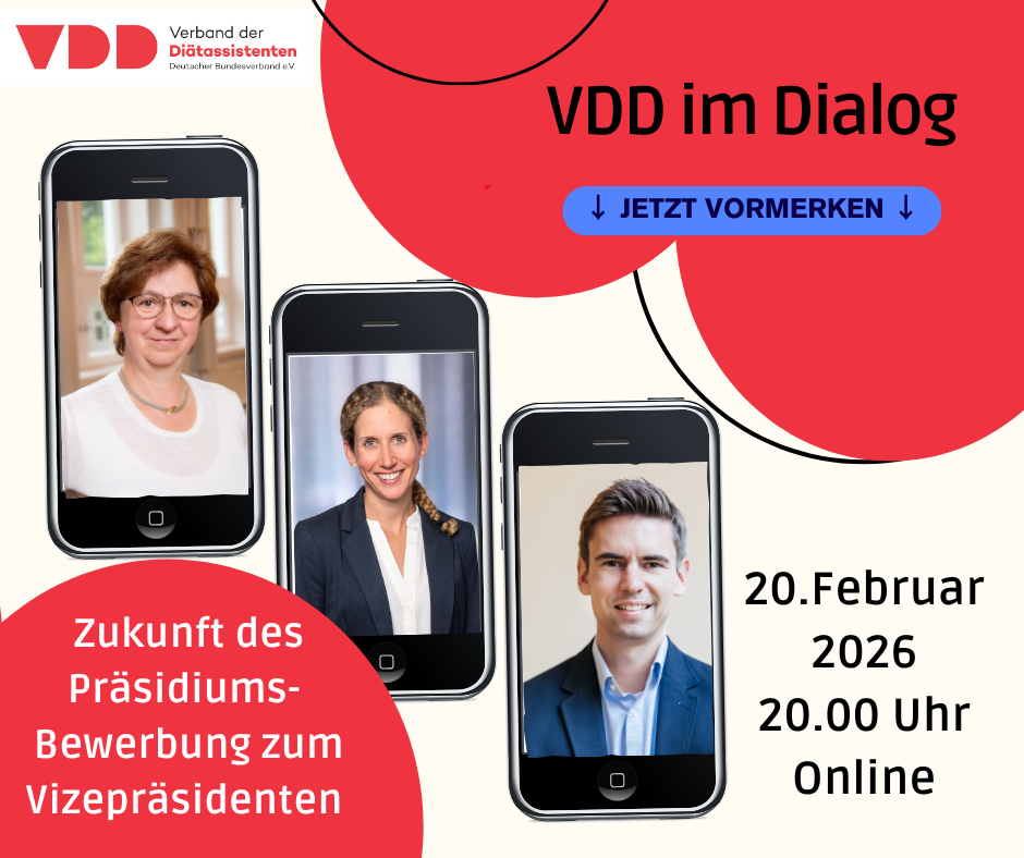 „VDD & Friends: Gemeinsam ist MEHR drin“. Vom 7. bis 9. Mai 2026 findet der VDD-Bundeskongress in Wolfsburg statt, in diesem Jahr erstmals zusammen mit den anderen Verbänden der Ernährungstherapie. Kooperationspartner sind der Berufsverband Deutscher Ernährungsmedizinerinnen und Ernährungsmediziner e.V. (BDEM), die Deutsche Gesellschaft für Ernährungsmedizin e. V. (DGEM), die Deutsche Akademie für Ernährungsmedizin e. V. (DAEM) und der BerufsVerband Oecotrophologie e.V. (VDOE).